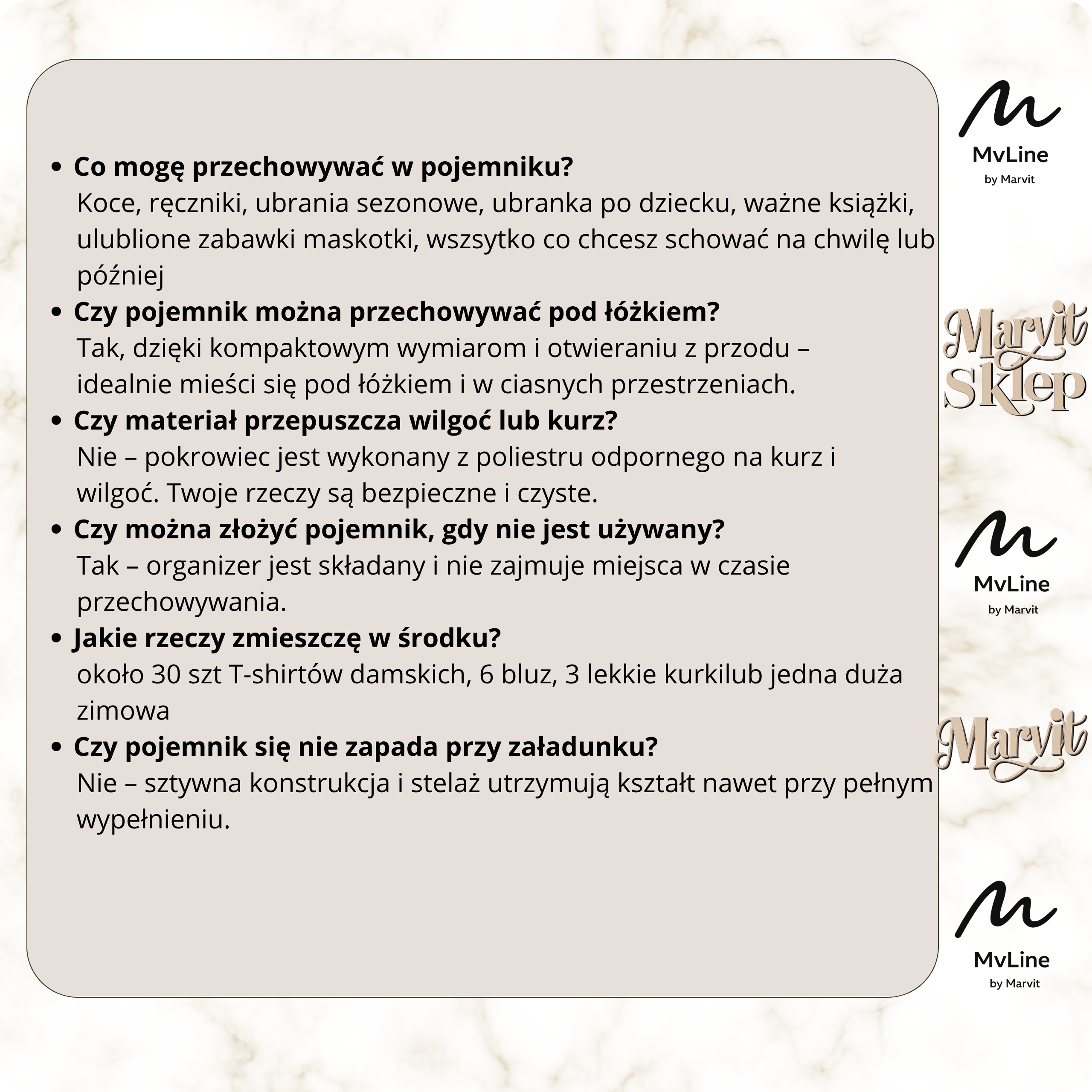 Ustawiaj organizer wyłącznie na stabilnej, równej powierzchni, aby zapobiec jego przewróceniu i ewentualnym urazom. Nie przekraczaj maksymalnego obciążenia, aby uniknąć uszkodzeń konstrukcji lub zawalenia się pojemnika. Przed użyciem sprawdź, czy produkt nie posiada ostrych krawędzi mogących spowodować skaleczenia.