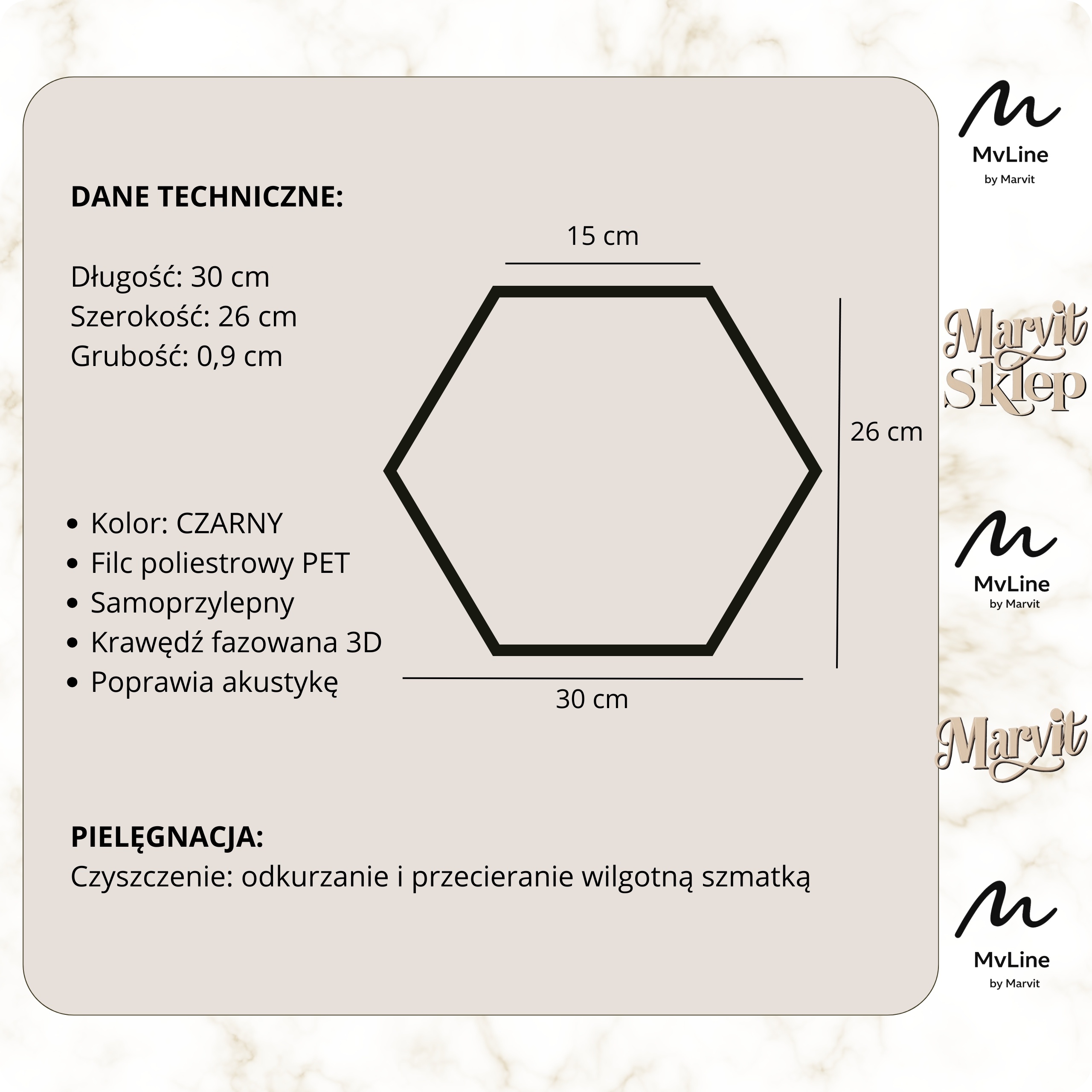 Czarny panel heksagon 30×26 cm z filcu PET - samoprzylepny, estetyczny i praktyczny. Świetny wybór do nowoczesnych wnętrz.