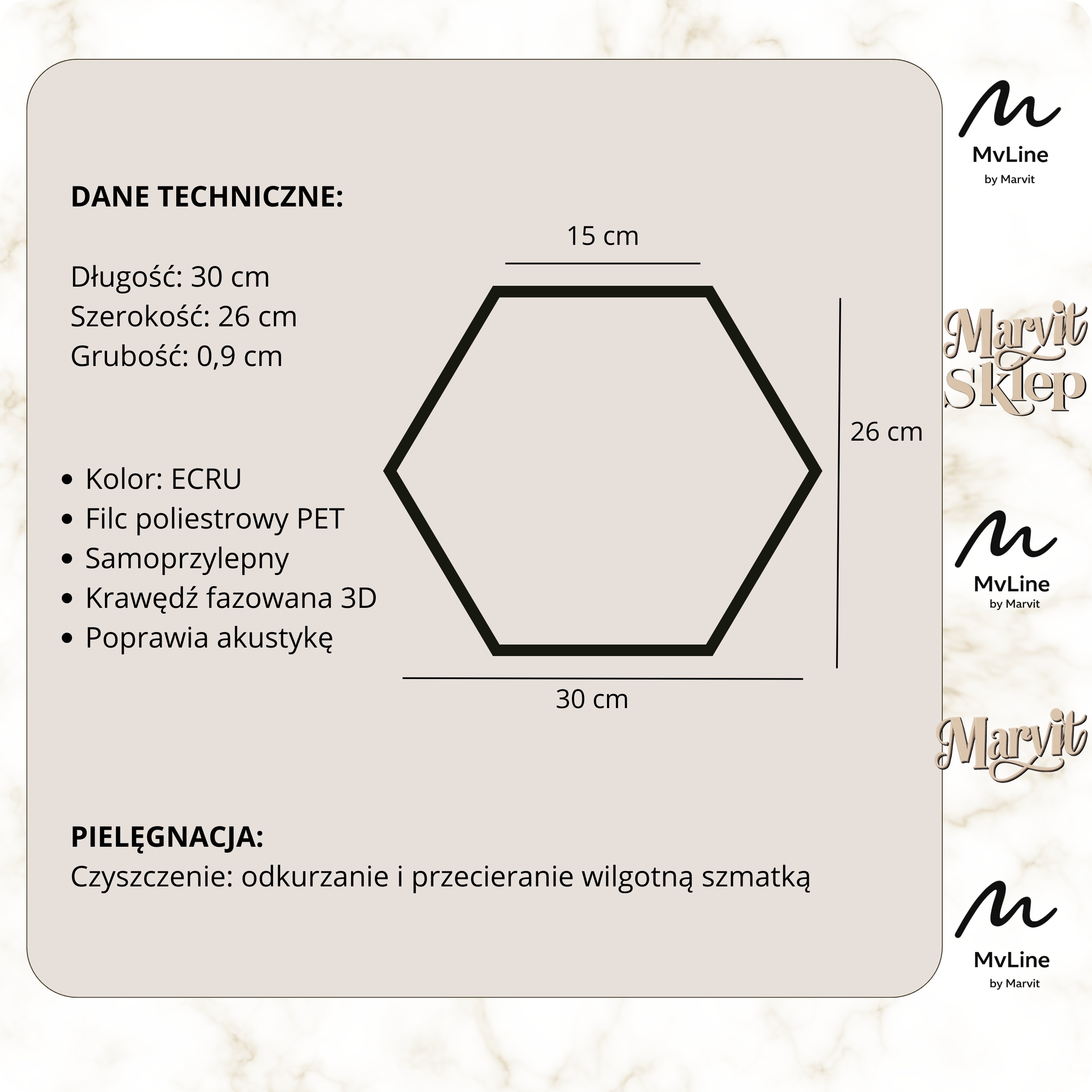 Ecru panel filcowy 30×26 cm, heksagonalny, grubość 0,9 cm. Ociepla wnętrze i tłumi hałas. Montaż bez wiercenia.