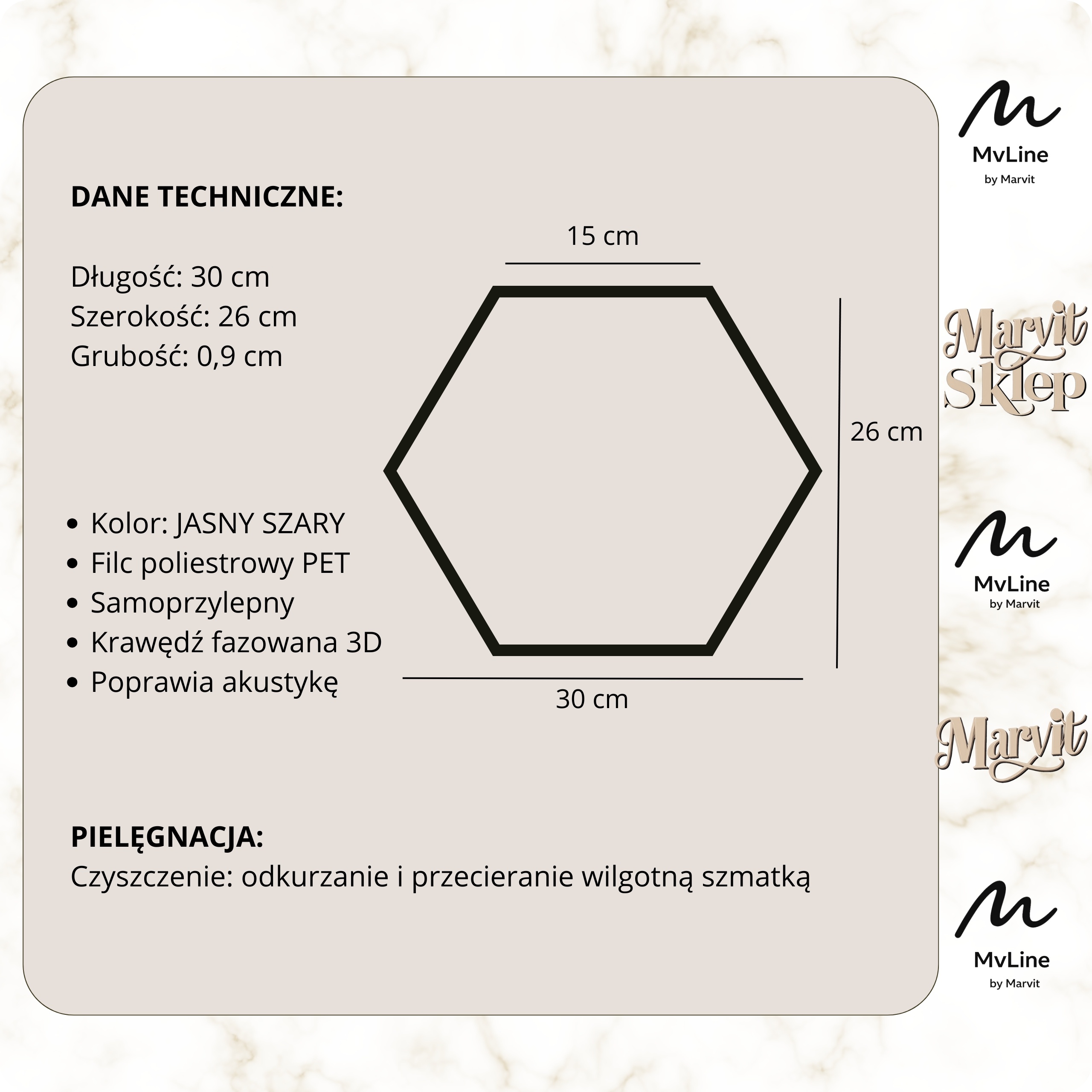 Jasny szary panel ścienny heksagon 30x26 cm z filcu PET - samoprzylepny, wyciszający, dekoracyjny, grubość 0,9 cm