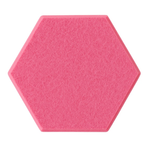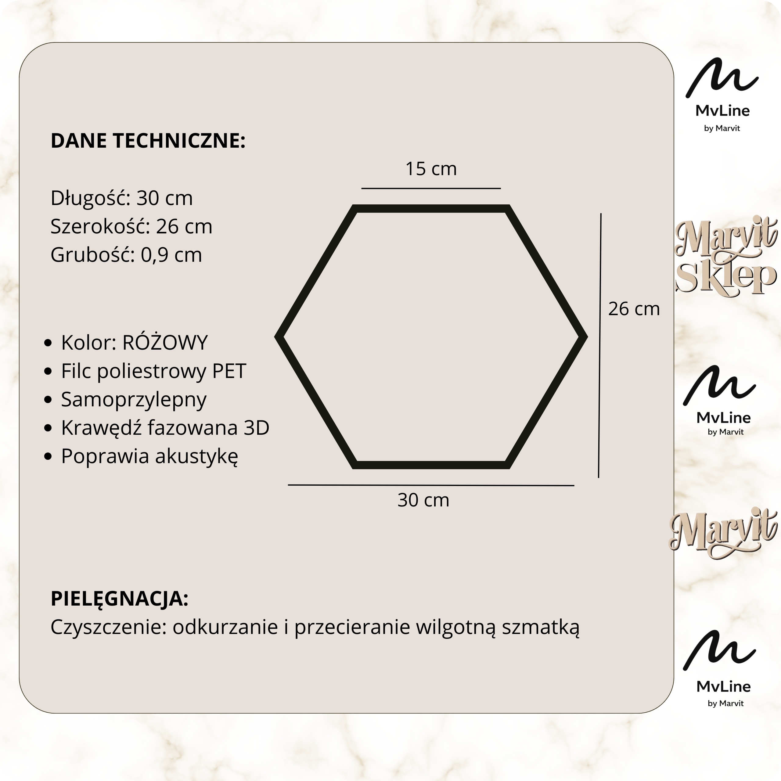 Różowy heksagon 30×26 cm z filcu PET - dekoracja ścienna i wygłuszenie w jednym. Samoprzylepna warstwa dla łatwego montażu.